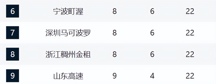 宁波、深圳和浙江排在6-8,都是8胜。这轮宁波击溃了山西,攻守全部保持压制。深圳现在的侵略性还非常强,只要打快,对手基本上很难跟上。浙江目前已经四连胜, 他们的趋势越来越好。