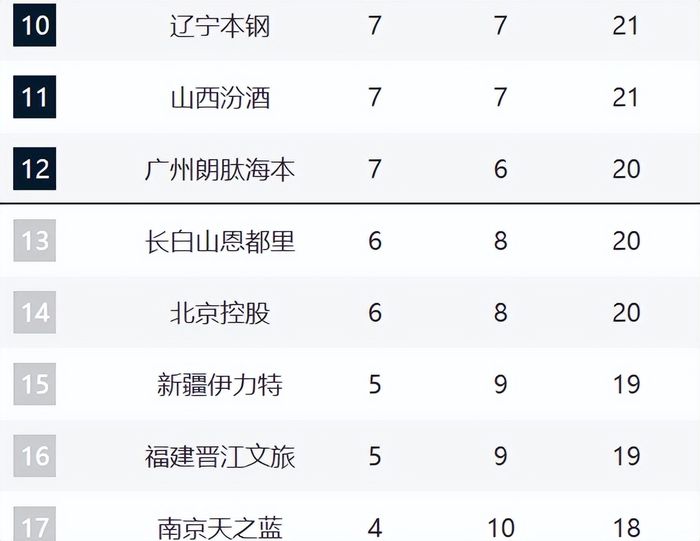 辽宁、山西、广州排在10-12。现在辽宁和山西都是两连败,排名持续下滑。辽宁是因为阵容实力下滑,进攻端很难有人站出来。山西则是因为潘江的执教问题,现在攻守全部出现问题。广州这轮输给天津,现在他们的战绩逐渐下跌了。